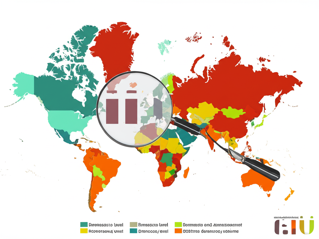 全球地圖顯示各國民主水平,經濟學人智庫標誌與放大鏡象徵民主發展的測量與分析