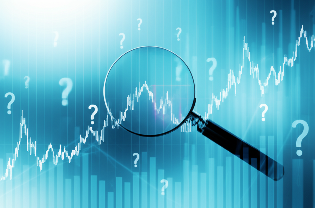 神秘股市圖示,波動曲線與問號環繞,放大鏡揭露股價背後隱藏力量